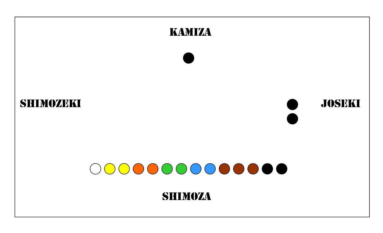 Cette disposition, à une époque où les dojos étaient des lieux d’enseignements jalousement protégés, est un choix stratégique ; les débutants ne sont rien d’autre que de nouveaux venus, des personnes que l’on connaît mal, voire pas du tout, et surtout dont on ne connaît pas encore les intentions. En les plaçant face au Senseï, à sa droite, celui-ci à la possibilité de voir venir une éventuelle attaque et de pouvoir dégainer facilement son sabre pour se défendre.